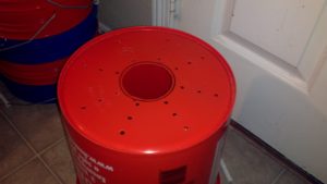 Here are some pictures from the bucket system. As you can see, I ran two separate hoses to different areas on my driveway. The hose fed a water bucket outfitted with a Kerik value, which looks somewhat like the old toilet flush valves. This valve maintained a constant water level in a feeder bucket. The feeder bucket is covered by screen to prevent mosquitoes, and allows you to add water manually, or will allow rainwater.