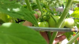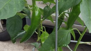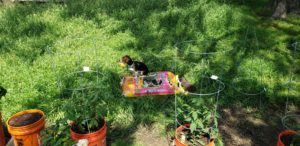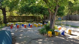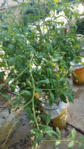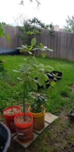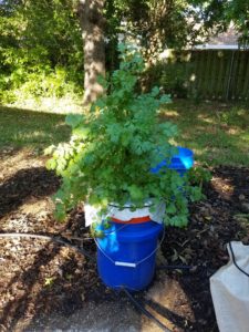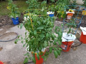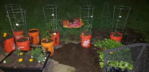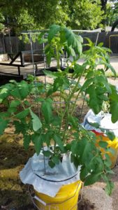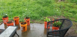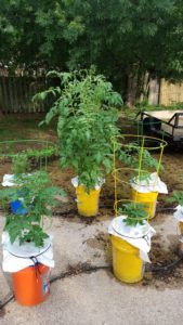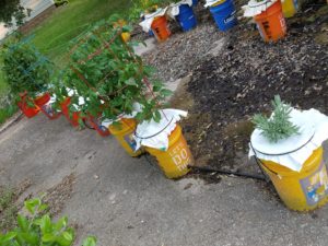 I arranged one set of buckets under a tree for some shade, and those buckets contained my peppers. The other set of buckets were tomatoes and herbs.
